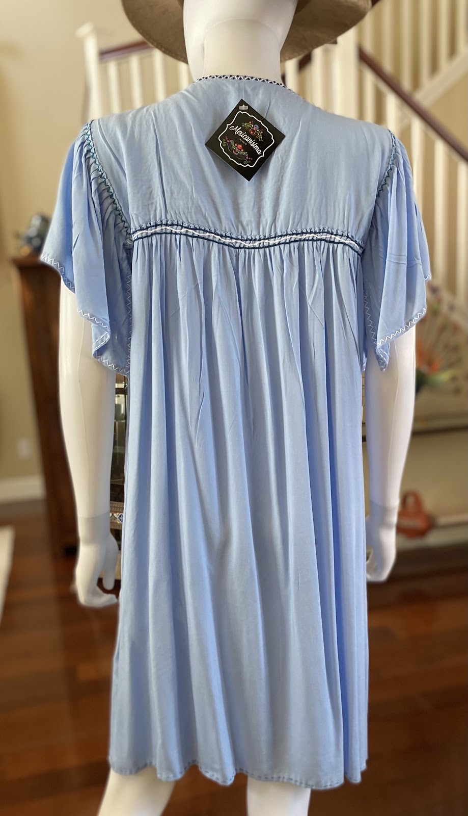 Hermoso vestido del estado de Chiapas, México. En algodón color azul bebé, bordados a mano hermosos diseños en el frente del vestido.