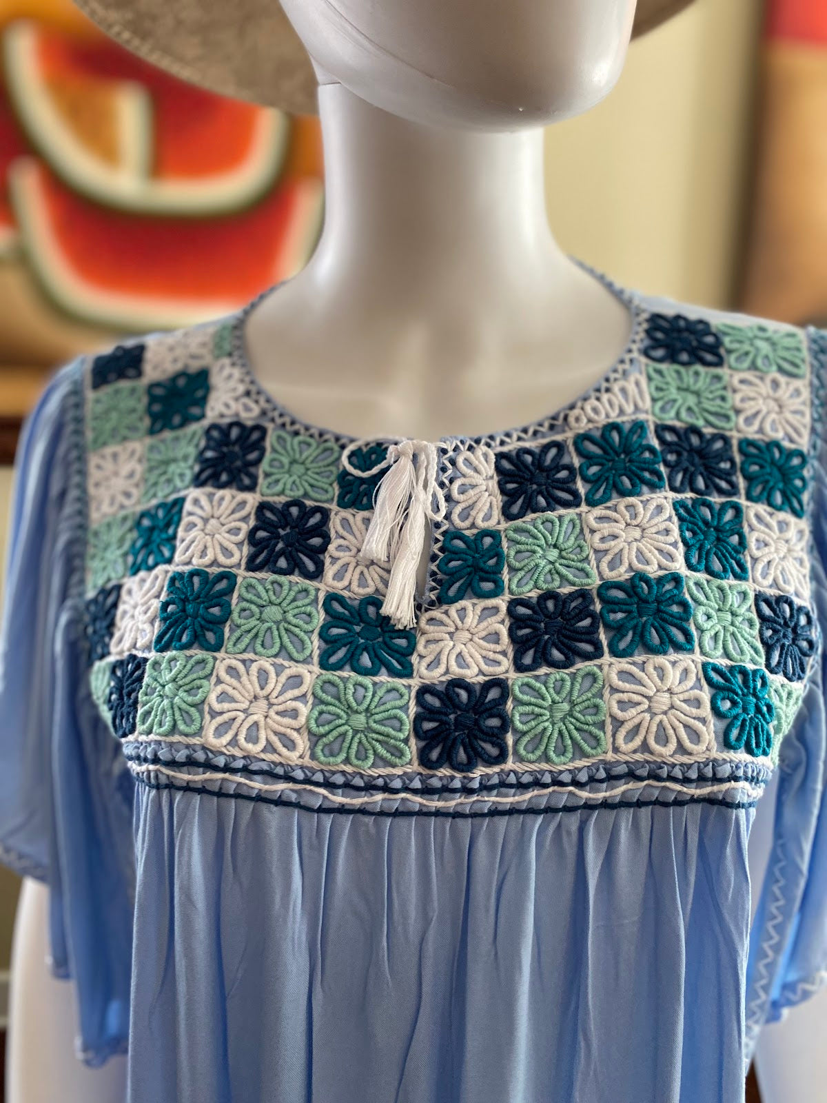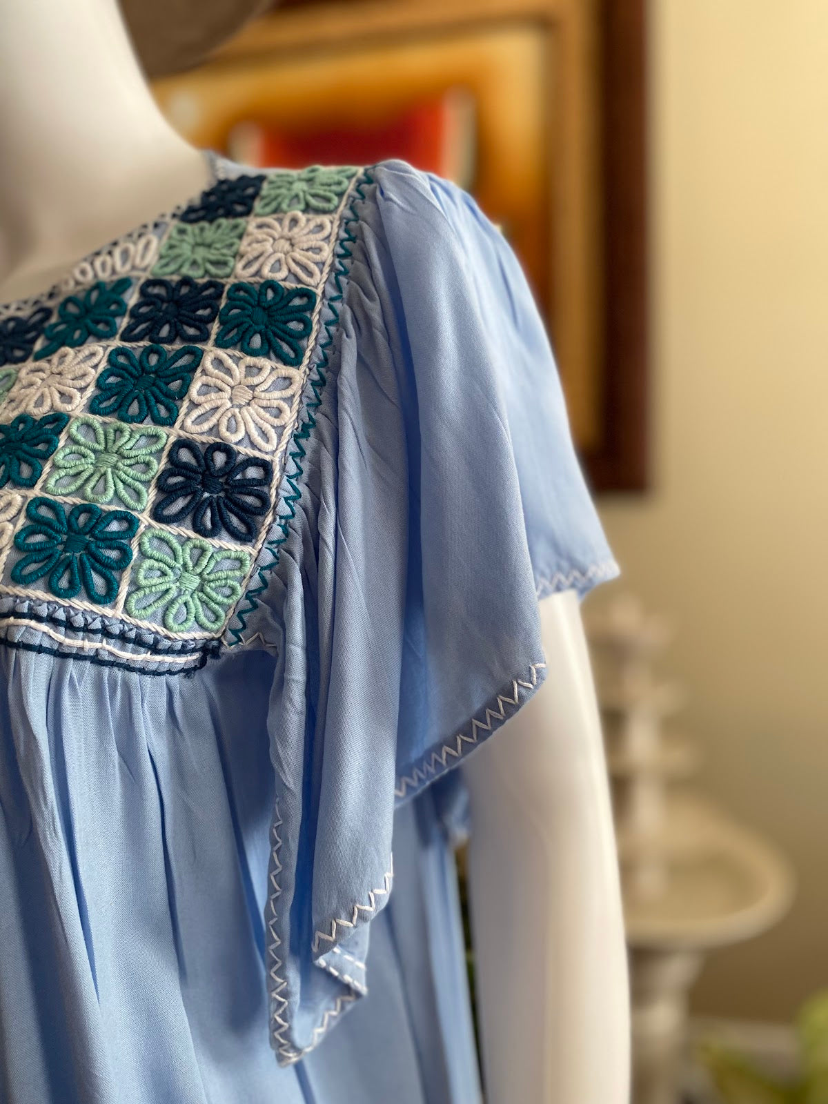 Beautiful Mexican dress from the state of Chiapas, Mexico. Made out of baby blue cotton with flowers hand embroidered with amazing designs, on one side of the dress Measurements: 40” chest, 60” waist, and 38” length.