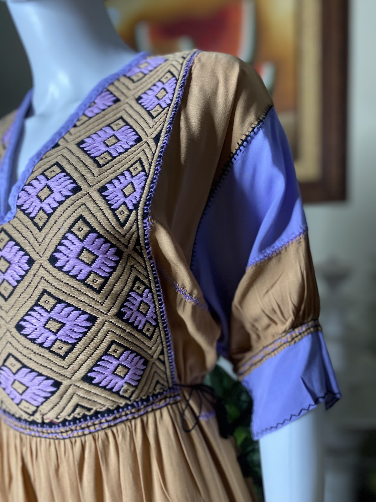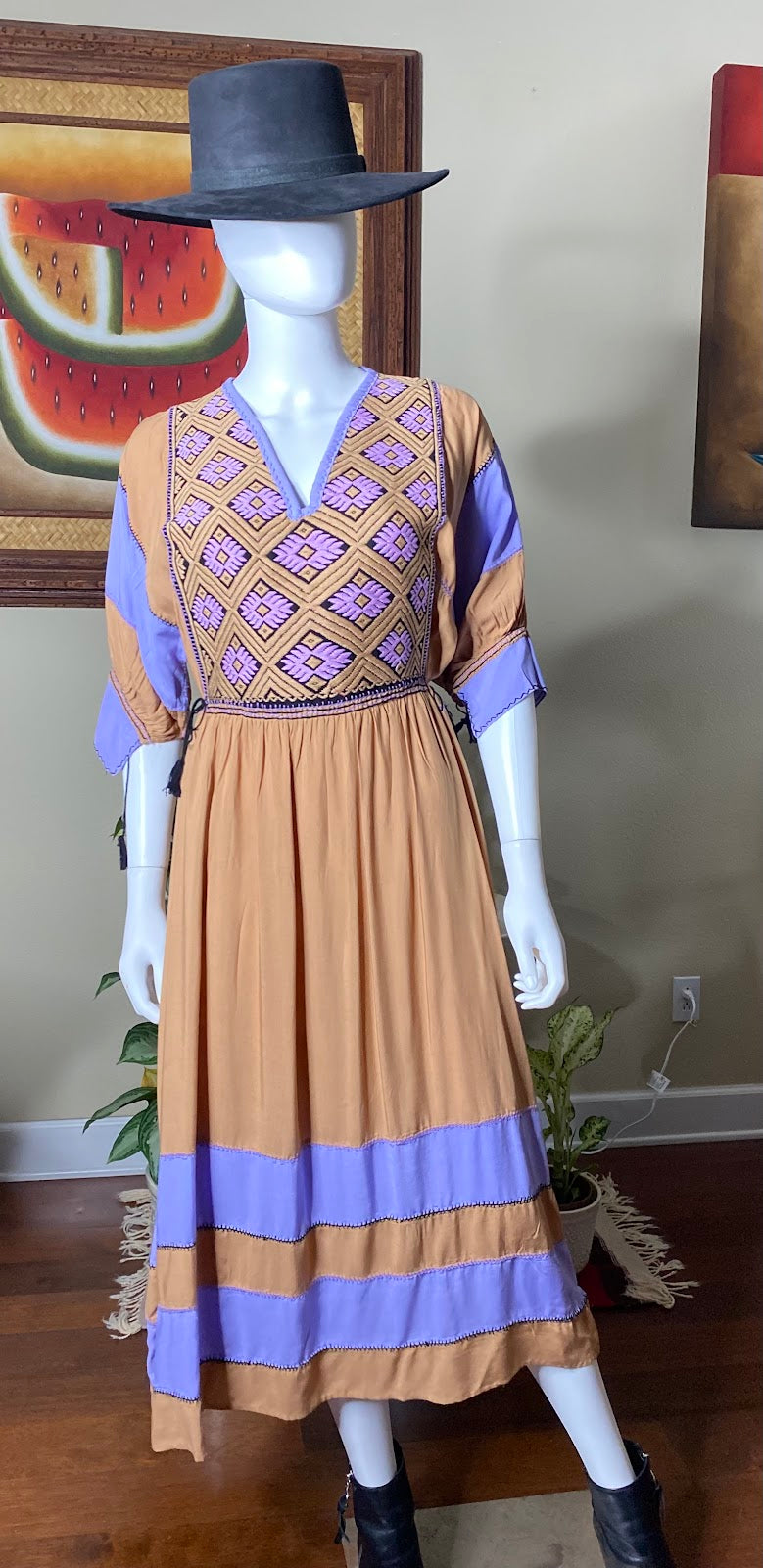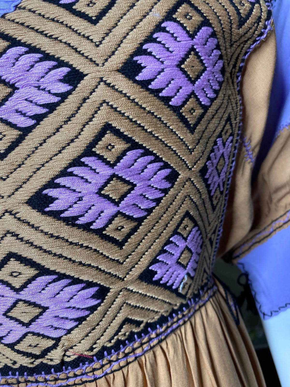 Beautiful Mexican dress from the state of Chiapas, Mexico. Made out of gold with violet cotton, hand embroidered and loomed with amazing designs, on both sides of the dress Measurements:48” chest, 48” waist, and 50” length.
