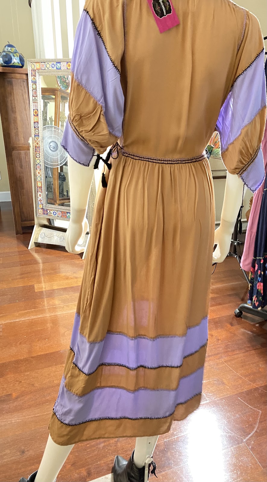 Hermoso vestido largo del estado de Chiapas, México. En algodón color dorado con violeta, bordados a mano y en telar hermosos diseños por ambos lados del vestido.