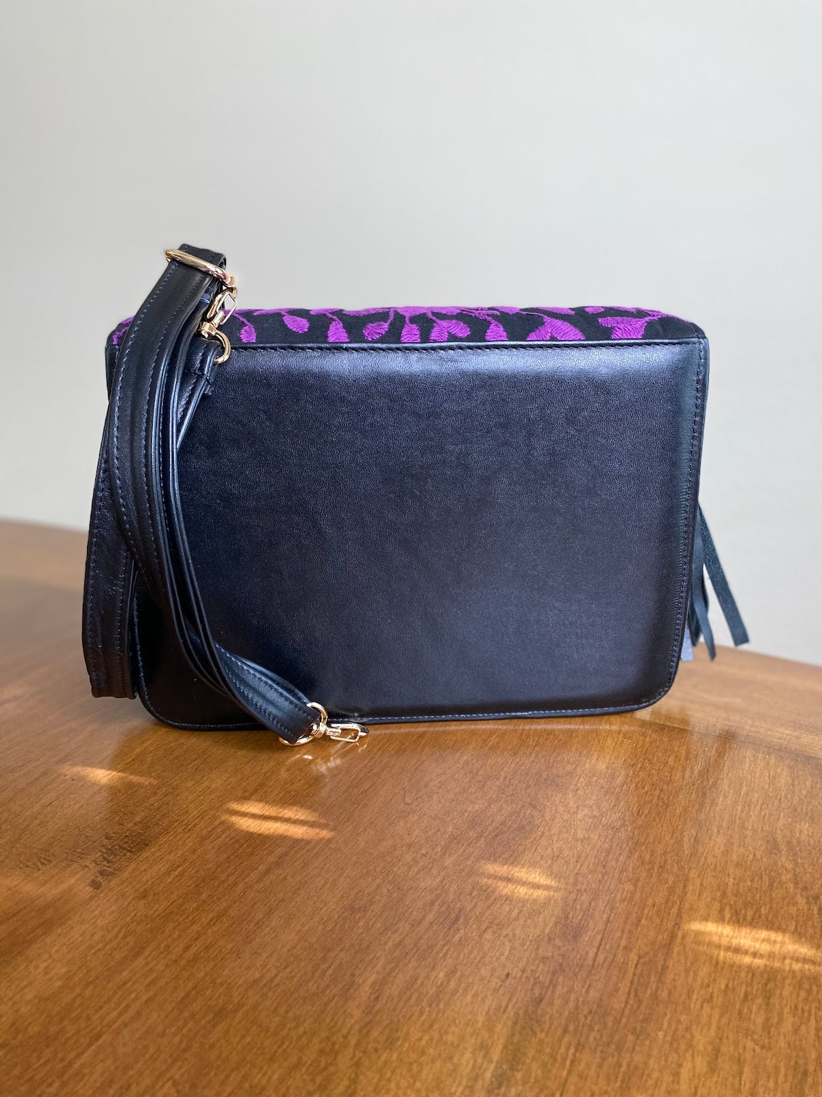 Beautiful leather hand-embroidered crossbody in black and purple. Made by Renho. Carefully crafted by Mexican artisans who bring to life amazing designs.