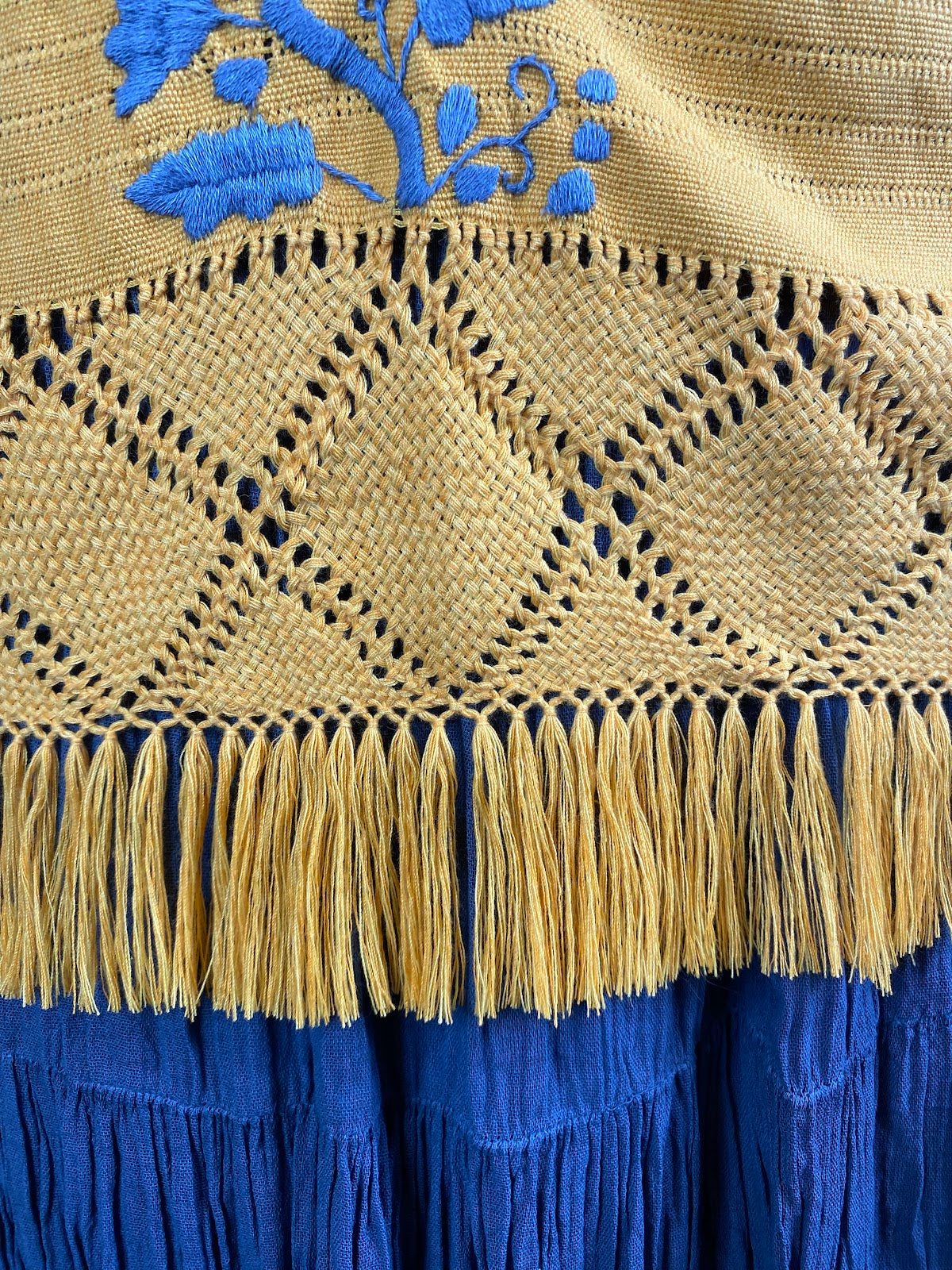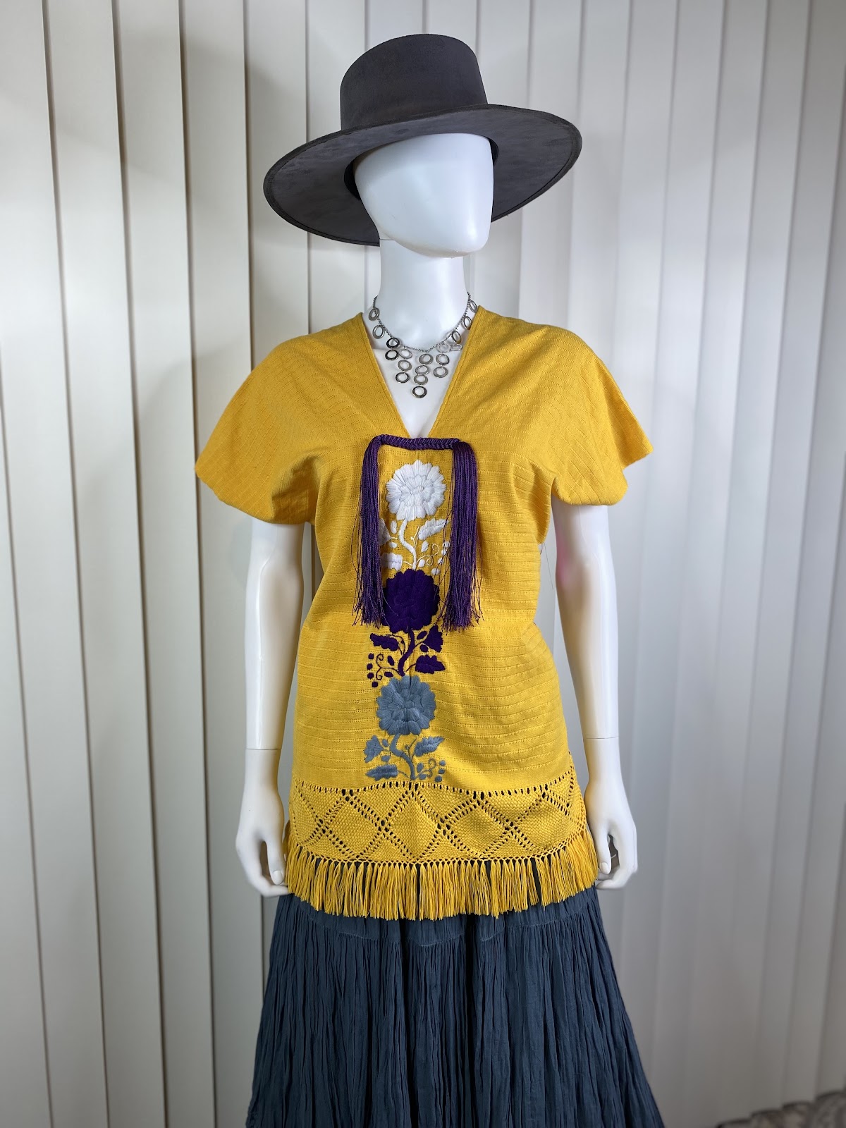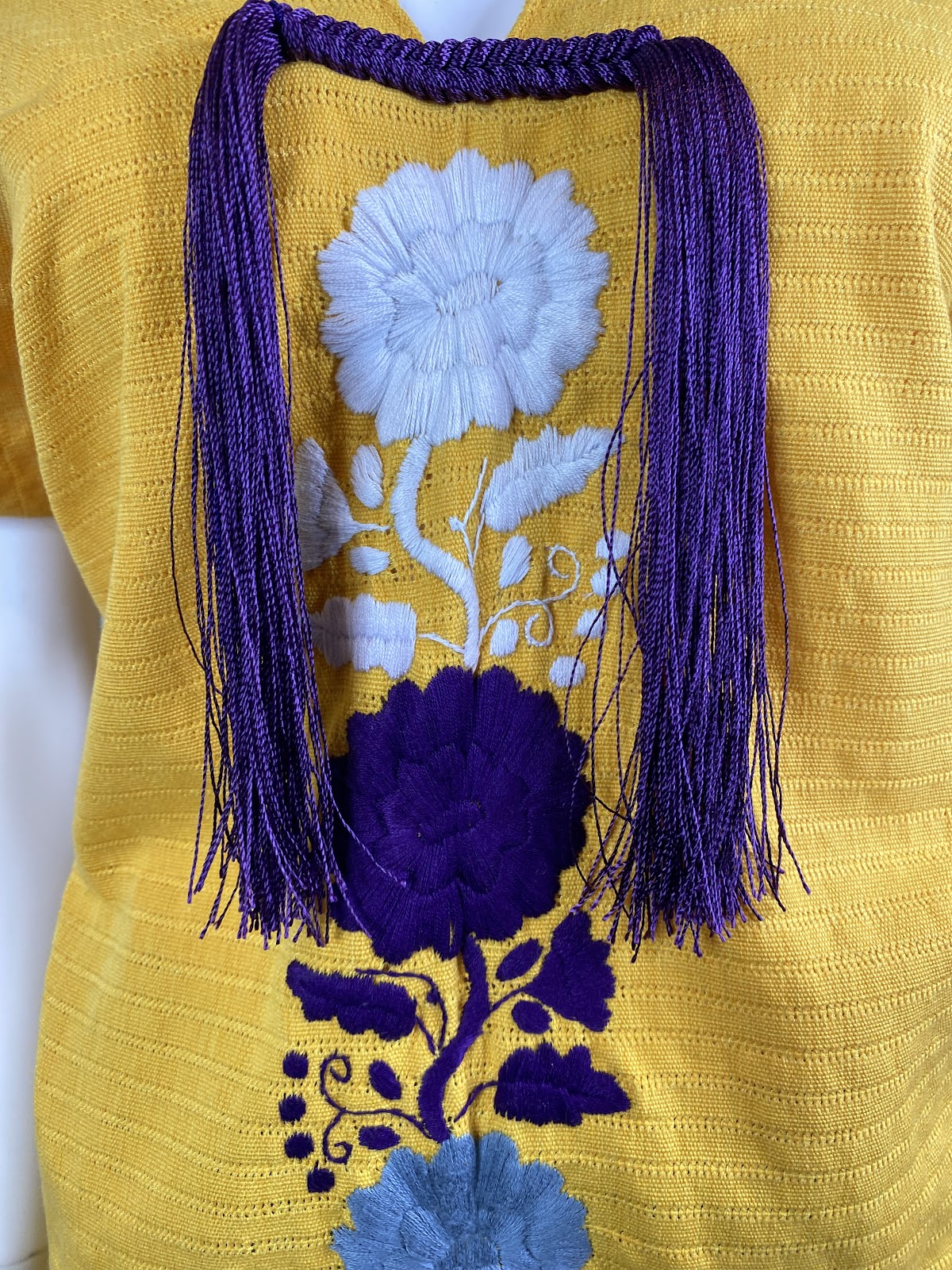 Hermosa blusa huipil del estado de Oaxaca, México. En algodón color amarillo, bordado a mano maravillosos diseños en blanco, morado y gris en ambos lados de la blusa.